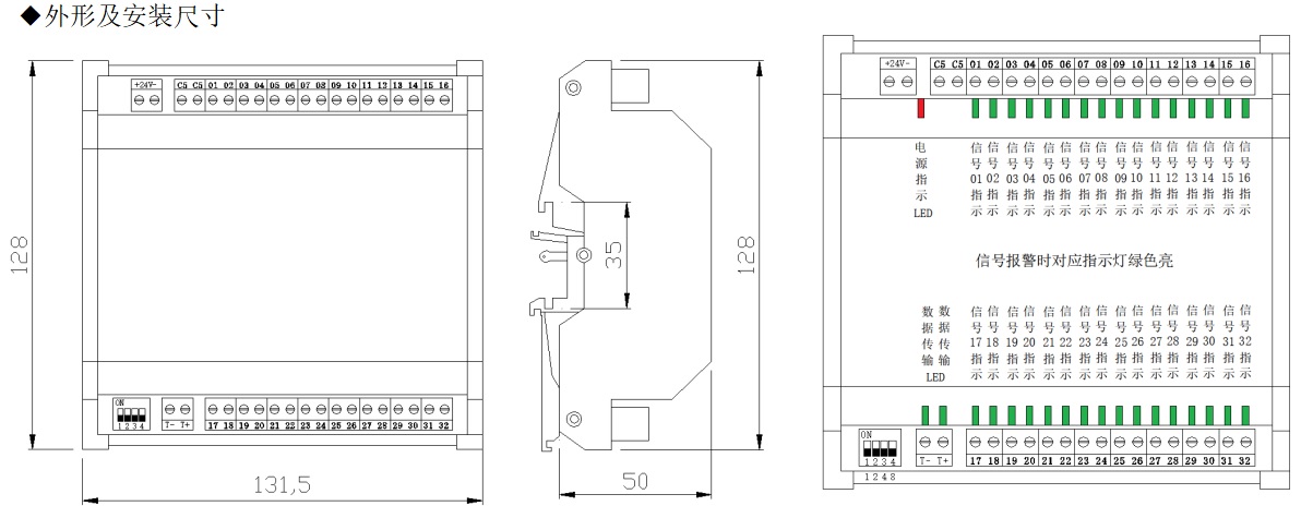 CAKJ-32DIT干接點(diǎn)信號(hào)采集模塊,接點(diǎn)信號(hào)開入,485通訊輸出。接點(diǎn)接通指示燈亮。