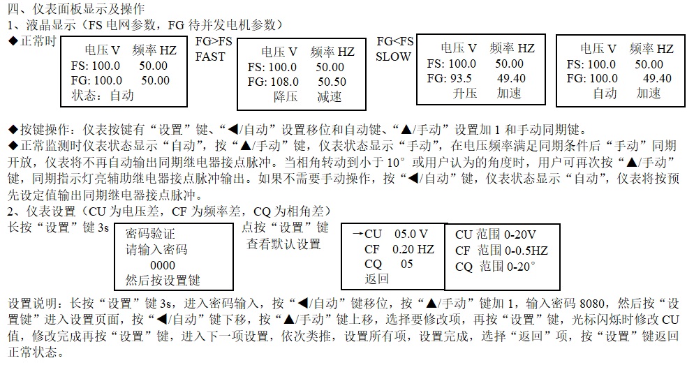 ◆當待并聯(lián)發(fā)電機的電壓和頻率大于電網(wǎng)的電壓和頻率時,液晶顯示狀態(tài)“降壓 減速”,如果小于電網(wǎng)的電壓和頻率時,液晶顯示狀態(tài)“升壓 加速”。