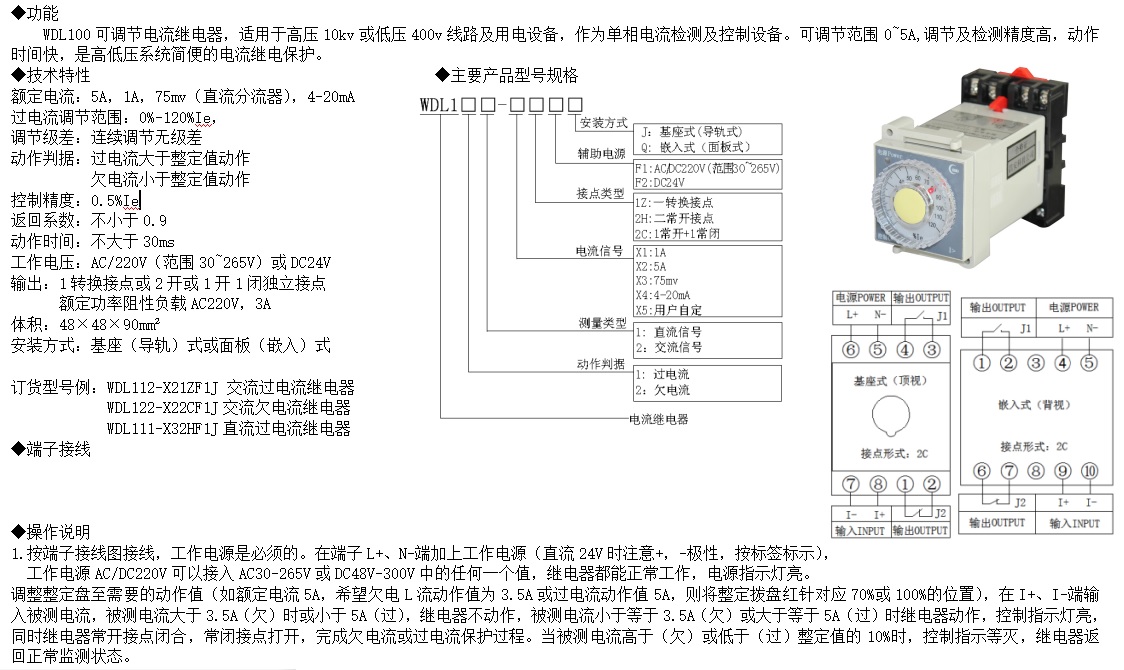 WDL100可調節(jié)電流繼電器,適用于高壓10kv或低壓400v線路及用電設備,作為單相電流檢測及控制設備??烧{節(jié)范圍0~5A,調節(jié)及檢測精度高,動作時間快,是高低壓系統(tǒng)簡便可靠的電流繼電保護。