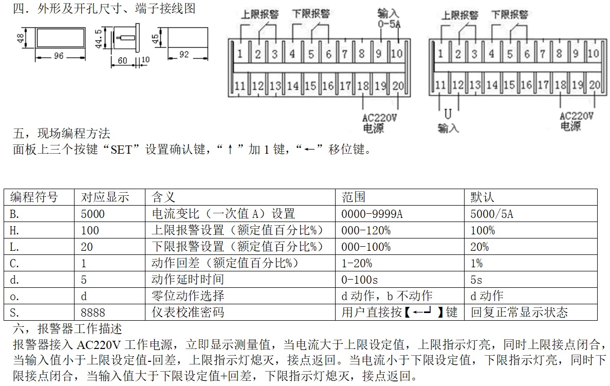 報警輸出:過流和低電流值可設置,兩路繼電器接點輸出