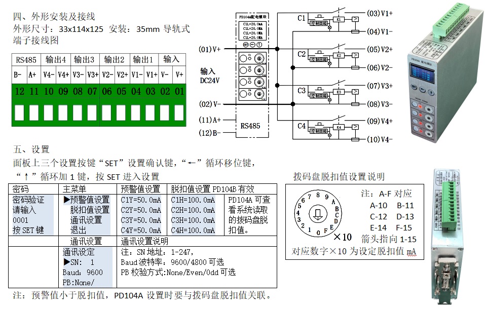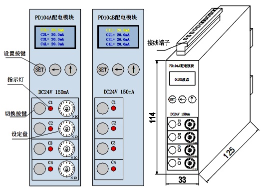 PD104系列直流配電控保模塊是DC24V直流配電系統(tǒng)控制保護(hù)模塊,以下簡(jiǎn)稱模塊,該模塊具備1路輸